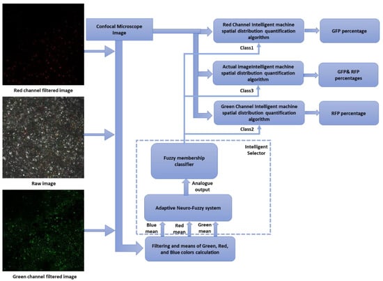 The confocal microscope output images are differed based on the number of channels, filters, etc. As can be inferred from Figure 2, images have a great diversity of processing perspectives. This, in turn, provides a challenging opportunity for artificial intelligence to be part of the processing system. Consequently, the designed intelligent machine spatial distribution quantification system starts with an intelligent selector. The intelligent selector is responsible for activating the appropriate processing algorithm to extract the spatial distribution of red and green colors as a percentage. The system’s main parts are shown in Figure 3 and discussed accordingly.