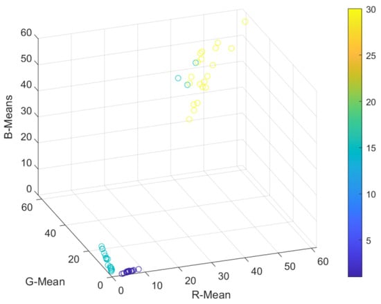 The average experts’ opinion is represented by the color bar where integer 1 for Class 1 (red channel filtered algorithm is activated), integer 15 for Class 2 (green channel filtered algorithm is activated), and integer 30 for Class 3 (actual image algorithm is activated). R, G, and B means are drawn for the collected 100 points (confocal microscope images).