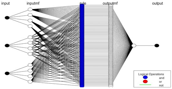 The designed adaptive neuro-fuzzy single analog output structure with five layers: three inputs, four membership functions for every input, rules to control the operation, output membership function, and the summarized output.