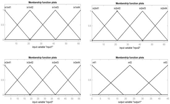 The nodes in Layer 3 (rules layer) provide what is known as firing strength, which is the AND operation of fuzzy membership in all dimensions. The node i of Layer 4 takes the ratio of the ith rule’s firing strength to the sum of all rule’s firing strengths. For that reason, the outputs of this layer represent the normalized firing strength. The single fixed node in Layer 5 computes the overall output by summing all coming signals from the previous layer. Consequently, the process of defuzzification is achieved by obtaining a crisp overall output. For a multiclass problem, the final layer is the fuzzy membership output layer that uses the membership function shown in Figure 6 to select one of the three classes called the fuzzy membership classifier.