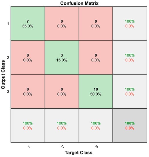 The system tracking ability is high enough to achieve high accuracy in the output fuzzy membership layer. The classification accuracy is 100% in total and 100% for each class, as seen from the confusion matrix in Figure 12. Accordingly, the intelligent selector works perfectly in activating the suitable algorithm for the FCM image.