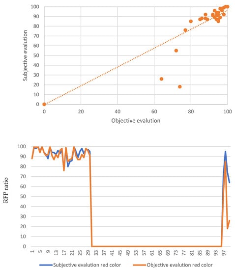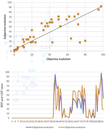 The correlation of subjective and objective evaluation of RFP ratio estimation: (Top) Using correlation line; (Bottom) actual RFP ratio estimation by every sample number on the x-axis.