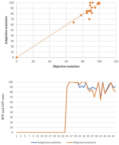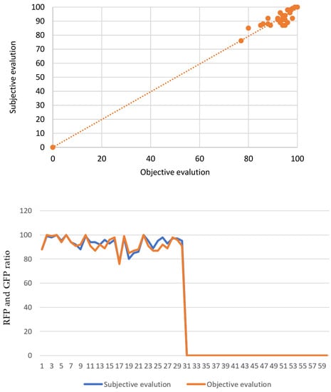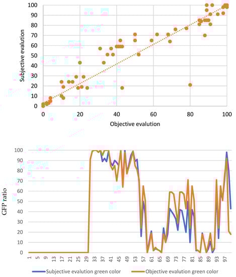 The correlation of subjective and objective evaluation of GFP ratio estimation: (Top) Using correlation line; (Bottom) actual GFP ratio estimation by every sample number on x-axis.