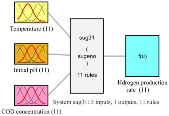 Without having an accurate model for the process under investigation, it is not possible to rely on its results. Both Fuzzy logic (FL) and artificial neural networks (ANNs) have their own merits. FL can effectively handle input–output data of a system with nonlinear relationships [36]. However, ANN can be trained with a training algorithm such as backpropagation (BP) [37,38]. Certainly, combining both techniques together will definitely produce a more powerful tool. ANFIS merges the concepts of both Fuzzy logic and neural networks in one arrangement. This inspired the authors to apply the ANFIS in building the model of the microbial electrolysis cell (MEC). The ANFIS simulates bio-hydrogen production during the wastewater treatment process by MECs in terms of incubation temperature (°C), initial potential of hydrogen (pH), and influent COD concentration (%). The contributions of this work can be outlined as follows:
