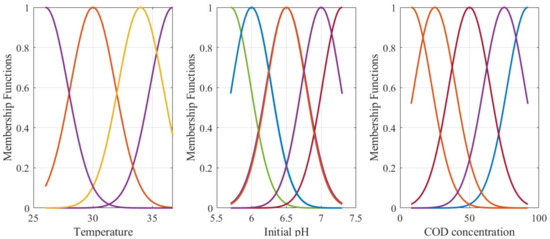 Referring to Table 1, the MSE values are 2.74 × 10−13 and 5.23 × 10−7 during training and testing, respectively, whereas the RMSE values are 0.0029 and 0.0541 during training and testing, respectively. The coefficients of determination are 1.0 and 0.973, respectively, for training and testing. Compared with the response surface methodology (RSM [39]), the coefficient of determination increased from 0.8953 using RSM to 0.963 using ANFIS, by around 7.56%. In addition, thanks to ANFIS modelling, the RMSE decreased from 0.1924 (RSM) to 0.0302 using ANFIS. Lowering the RMSE and boosting the coefficient of determination prove the successful ANFIS modelling phase and can be used for the model predictions. Figure 2 shows three-input one-output configuration of the model. The three input parameters are the incubation temperature, the initial pH, and the influent COD concentration, and the output is hydrogen rate. In the current model, the subtractive clustering method produced a lower number of rules, which is 11, as demonstrated in Figure 3. However, the MFs are shown in Figure 3, and it is worth mentioning that every colored MF curve represents a cluster in the input space.