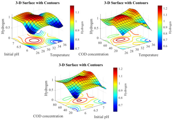 Figure 4 illustrates the three-dimensional structure of the ANFIS model. The interaction between controlling factors, i.e., initial concentration of the COD, operating cell temperature, and pH on bio-hydrogen production, is shown. The highest values of the output go to the dark red, but the lowest values go to the dark blue. The figure shows that the interaction between every two factors positively affects bio-hydrogen productivity compared to the single factor. As is clear from the figure, the increase in the initial COD resulted in increasing the bio-hydrogen production up to 60%, and then the bio-hydrogen production is decreased with the further increase in the COD concentration. Similarly, it is noticed that the bio-hydrogen productivity increases with increasing the pH up to 6.5, then decreases with the further increase in the pH. In the same manner, the best bio-hydrogen production is achieved at an optimum operating cell temperature of 30 °C. The improved bio-hydrogen production by increasing the COD up to 60% would be related to the increase in the COD (fuel) used by the microorganism for bio-hydrogen production. On the other hand, at higher COD values, the bio-hydrogen decreased due to the poisoning effect of higher COD values on the microorganisms [39,42,43]. The best bio-hydrogen productivity obtained at pH 6.5 is related to the high microbial activity at moderate pH values compared to the acidic (lower pH values) or alkaline (higher pH values) [44,45,46]. Similarly, the activity of the microorganisms increases with increasing the cell temperature up to around 30 °C. However, at higher cell temperatures the activity of the microorganisms decreases, and thus bio-hydrogen production decreases [47,48].