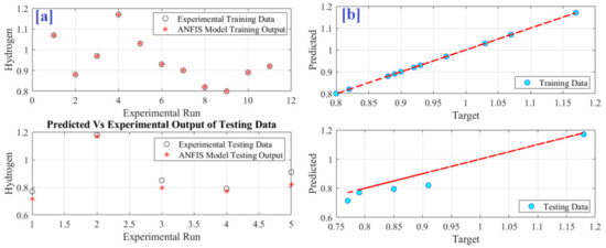 The bio-hydrogen production of a microbial electrolysis cell is simulated in terms of three parameters: the incubation temperature, the initial pH, and the influent COD concentration. To achieve a smoother prediction curve, the gaussian shape is a very suitable MF, as it provides a good transition from a predicted point to the next, contrary to the other triangular or trapezoidal shapes which produce jumps in the predictions. Consequently, in data-based modelling, the gaussian shape performs better, however, in control systems, triangular and trapezoidal shapes are the most suitable MFs. On the other hand, the SC technique produces the optimal as well as the smallest number of rules that can effectively handle the trend of the dataset. In the current research, the considered data are composed of 16 points. To train and test the ANFIS model, these points are separated into two sections with a ratio of 70:30. Therefore, 11 points are assigned for training and 5 points are used for testing. The sub-cluster is used to create the ANFIS rules, of which there are eleven, and number of epochs is selected to two for avoiding overfitting. To construct a strong model, the procedure of continuous training was conducted for the ANFIS model up to an achieved stopping criterion. In the current work, the training procedure stops when the testing data mean squared error (MSE) obtains the lowest value. Therefore, the model is trained up to when a smaller MSE is achieved. The statistical indicators are estimated in both stages, the training and the testing, to evaluate the performance of the resulting model in every stage. Table 1 demonstrates the values of mean squared error (MSE), root mean squared error (RMSE), and coefficient of determination (R2). The first two indicators (MSE and RMSE) determine the accuracy of the model’s predictions, while the latter (R2) determines the tracking ability. The model is said to be better when its predictions provide the lowest MSE and the largest R2 values for both groups of datasets (training and testing). It is worth mentioning that R2 is the squared value of the correlation coefficient, which implies that its value is in the range [0, 1], where 0 and 1 indicate no correlation and full correlation between the predicted and actual signals, respectively. The resultant statistical markers of the ANFIS model are presented in Table 1.