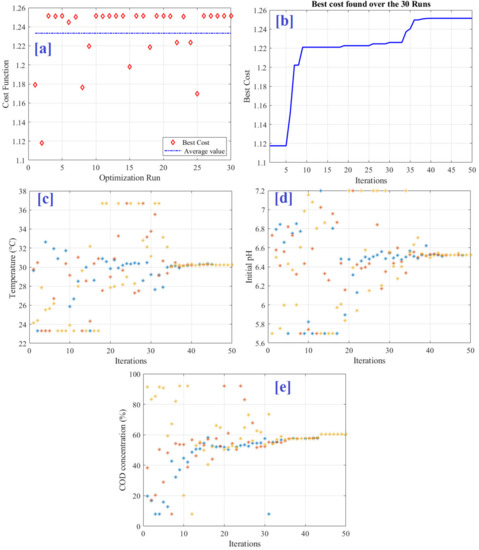 Optimization results: (a) cost function values of 30 runs, (b) best objective function variation (hydrogen production m3H2/m3d), (c) temperature (°C), (d) initial pH, and (e) COD concentration (%).