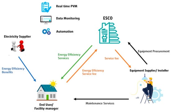 The above services function as components of the revenue streams, which, in turn, are, essentially, savings measured and verified by a robust, fair, and transparent Performance Measurement and Verification (PMV) methodology. The ESCO business model actors and relationships are depicted in Figure 4.