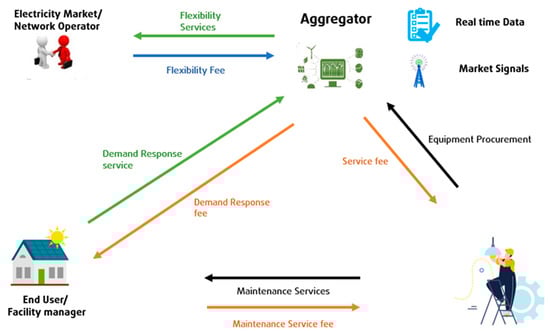 Demand side Aggregators on the other hand, are primarily interested in executing flexibility services on demand by grid operators (Explicit DR) or according to price signals from the markets (Implicit DR). Explicit DR implies direct participation in the balancing, capacity, or even wholesale markets. The participants receive direct compensation for providing the energy flexibility required. Implicit DR implies exposure to market or network charges according to the time of use of the electricity. Consumer behaviour is driven by real-time market signals triggered. In contrast to explicit schemes, the actor is not committed to act but, instead, receive the benefits in the form of a reduced energy bill. Although both demand response schemes are compatible and interesting [32], the business models proposed in this paper refer to explicit schemes to respond to market needs of distributors, network operators, and BRPs.