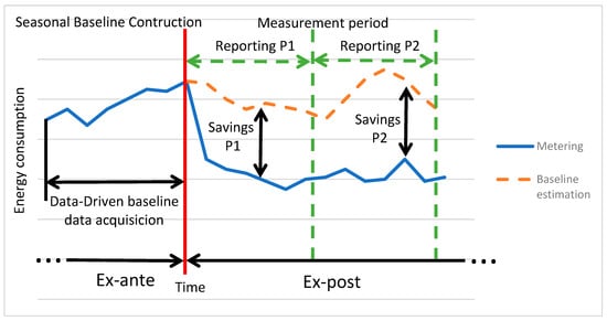 The EE PMV aims at measuring energy savings for smart retrofitting and the energy efficiency of new services. Savings are measured holistically at a dwelling or building level in specific periods of medium- and long-time horizons (e.g., billing periods). Savings are directly enjoyed by the end users, and they pay the ESCO a share proportionally to the savings obtained in the period for the service delivery. Savings are achieved from various implicit (behavioural changes) and explicit (automation) strategies, as well as from building and equipment retrofitting. Baselines are built based on historical data comprising a full year. If no historical data are available, baselines are constructed upon pre-selected models and, then, calibrated for a given period using the data flow of energy consumption and the energy consumption driving parameters in the Ex-ante period. Baselines are seasonal to provide a better fit to the actual building energy profile for every season of the year. Baselines are fixed in the reporting period, but they are subject to continuous accuracy checks that may reveal the necessity of non-routinary baseline adjustments calculated periodically at every billing or reporting period. In this sense, EE PMV methodologies are similar to existing protocols in use [36]. Figure 6 shows the ex-ante and ex-post scenarios for energy efficiency measurement and verification.