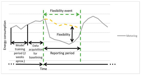 DR services offer aggregated domestic consumer demand flexibility to grid operators for congestion management and grid balancing services. These services are demanded on short event basis and the performance is measured via the energy shift achieved by the automated operation of available Distributed Energy Resources (DER) by the Aggregator. The Aggregator delivers this demand flexibility to the grid and shares the market remuneration with the flexibility providers or the building users. Flexibility-related events need a short-term forecast so the shortest possible reference period for baseline training is selected while guaranteeing an accurate prediction. Thus, the baseline is load-based and dynamic, as it is recalculated on a continuous basis as new data come into the moving reference or training period. This way, the baseline is updated to any change in external weather conditions or behavioural changes, avoiding the need of continuous manual adjustments, fitting to the latest user energy profile. Finally, the baseline is calculated using the values of the independent variables just prior to the event, thus reflecting the actual conditions that are the closest to the event. Figure 7 shows the Ex-ante and ex-post scenarios for energy flexibility measurement and verification.