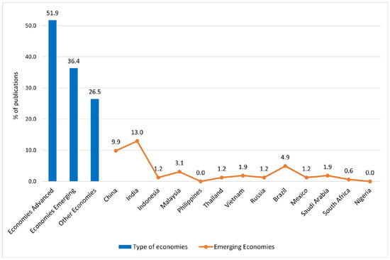 Percentage of papers on social sustainability in emerging economies (n = 162). NOTE: Parameters and Booleans used for WOS search: “Core Collection + Social near/0 sustainability or Social near/0 Sustainable (title) + Supply Chain (topic) + (2014–2022)”. The classification of results by developed and emerging economies was based on the recent report by the International Monetary Fund [38].