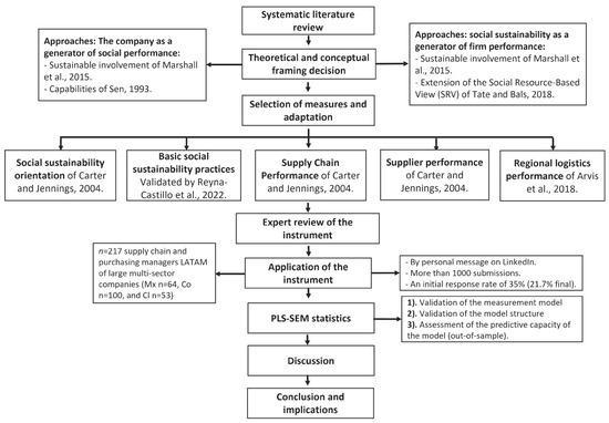 The social sustainability measures were taken from the result of the Factorial Analysis (FA) conducted in the Latin context by Reyna-Castillo et al. [30]. Under the perspective of Sen’s [29] essential aspects of social performance, they were based on measures validated in emerging Asia by Mani et al. [7]. The PA was tested on a population of purchasing managers from Mexico and Colombia. The items were statistically regrouped into 4 dimensions: External Community Development, Labor Rights and Health, Gender Inclusion and Equity, and Social Responsibility [30]. Since they provided a better explanation, social sustainability dimensions were unified into a second-order variable. From the approach of degrees of involvement with social sustainability proposed by Marshall et al. [63], the content of this construct was associated with basic social sustainability practices, which is why it is called by that name. Likewise, under the same approach of Marshall et al. [63], Carter and Jennings [62] took Buyer Investment, and Commitment measures were taken. Given the nature of the three items, based on intention rather than practice, they were dimensioned as aspects of orientation toward social sustainability. The Supplier Performance and Supply Chain Performance constructs were taken without adaptation from Carter and Jennings [62]. Finally, the four measures of the Regional Logistics Performance dimension were taken from the World Bank’s Logistics Performance Index (LPI) [40]. In summary, the design and validation process of the research instrument of this study allowed us to have a 28-item instrument contained in 4 constructs in addition to the general information questions (Appendix A). Once the survey was prepared, it was sent to a group of eight Mexican and Colombian experts: two academics for methodological input per country and two supply chain professionals per country to review the relevance of the items. The document was also analyzed to ensure that the language was as neutral as possible to avoid confusion due to the regionalisms of each country. The experts proposed minor changes and modifications to the questionnaire items, and consequently, changes and modifications were made. In the end, given the relevance of the surveys applied to the chain’s expert managers, they were retained. After editorial corrections and clarity of terms, the items were tested for validity and readability, as proposed by Heeler and Ray [82]. The experts proposed minor changes and modifications to the questionnaire items.