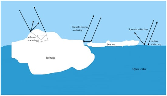 Microwave scattering mechanism from the iceberg, sea ice, and open water []. The black arrows depict the types of reflections involved for an iceberg surrounded by sea ice and ocean.