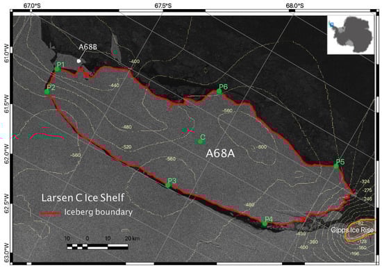 The contour of the seabed from the international bathymetric chart of the Southern Ocean (IBCSO) in the Antarctic polar stereographic projection overlaid with a Sentinel−1A synthetic aperture radar (SAR) picture for the study region (rectangle in the inset) taken on 27 July 2017. On the iceberg’s edges, points P2, P3, P4, P5, and P6 have barely displayed any calving. At sites P1, C, and P7, the iceberg’s distance traveled and heading (rotation) were computed.