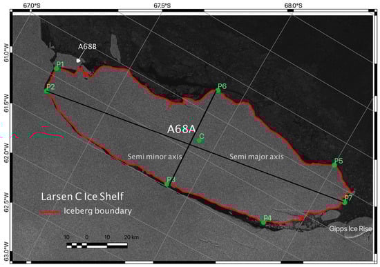 Depiction of the semi-major and semi-minor axis a few days after A68’s formation (27 July 2017).