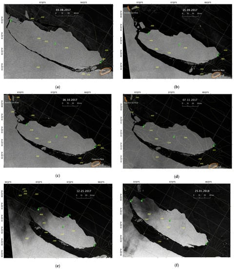 Sentinel-1 SAR images of iceberg A68A were acquired on (a) 3 August 2017; (b) 25 September 2017; (c) 26 October 2017; (d) 7 November 2017; (e) 25 December 2017; and (f) 25 January 2018.