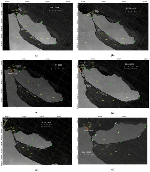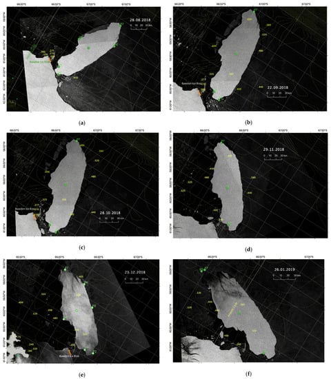 Sentinel-1 SAR images of iceberg A68A for (a) 24 February 2018; (b) 25 March 2018; (c) 24 April 2018; (d) 25 May 2018; (e) 30 June 2018; and (f) 31 July 2018.