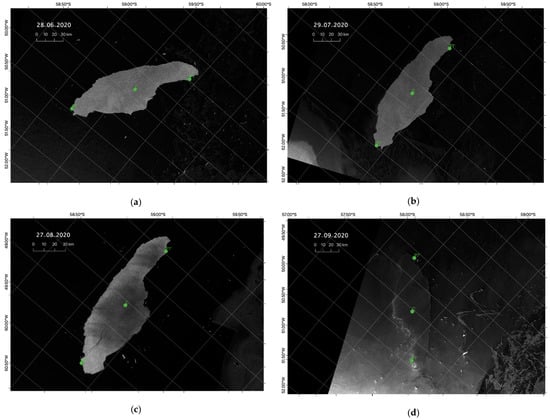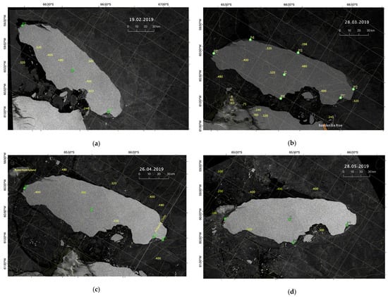 Sentinel-1 SAR images of iceberg A68A for (a) 19 February 2019; (b) 28 March 2019; (c) 26 April 2019; and (d) 28 May 2019.