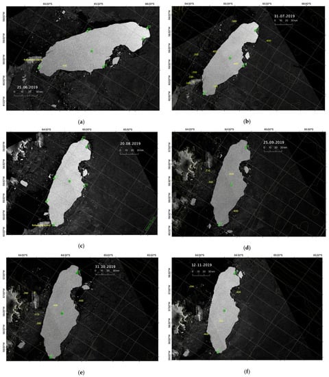 Sentinel-1 SAR images of iceberg A68A acquired on (a) 25 June 2019; (b) 31 July 2019; (c) 20 August 2019; (d) 25 September 2019; (e) 31 October 2019; and (f) 12 November 2019.