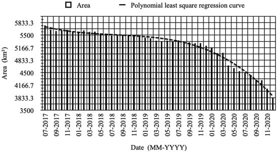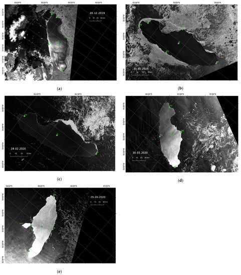 From 28 June 2017, until 29 January 2021, 47 Sentinel-1 SAR images were selected for this study, which were utilized to estimate the area and drift. Table A1 in Appendix A provides the specifics for each dataset. The images were obtained via the Data Search Vertex portal of the Alaska Satellite Facility.