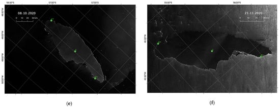 Sentinel-1 SAR images of iceberg A68A for (a) 28 June 2020; (b) 29 July 2020; (c) 27 August 2020; (d) 27 September 2020; (e) 8 October 2020; and (f) 21 November 2020.