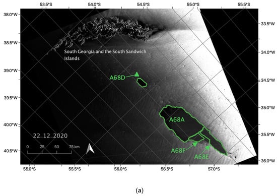 January 2021 continued with debris from these smaller fragments breaking away, as can be seen in the backscatter from the sea surrounding A68D and A68E (Figure 12b). Twenty-nine January, 2021 saw another calving occurrence (Figure 12c) with the formation of A68G (51 km × 16.77 km) and A68H (18.78 km × 8.3 km) standing at 671.86 km2 and 134.2 km2, respectively, leaving the largest piece A68A (64.23 km × 22.34 km) at 1365.42 km2, 23.71% of its original dimension.