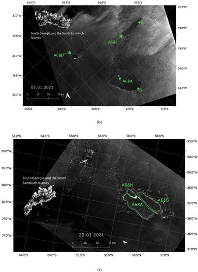 Sentinel-1 SAR image for (a) 22 December 2020 showing the calving of A68D, A68E, and A68F; (b) 5 January 2021 with A68E and A68D in the vicinity of A68A; and (c) 29 January 2021 with yet another calving of A68G and A68H.