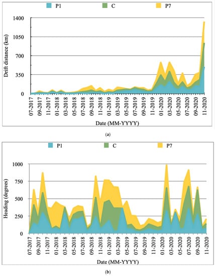 (a) Changes in the drift distance traveled by iceberg A68A’s north, center, and southern portions, namely, P1(P1′), C, and P7, respectively. (b) Changes in the heading (direction) of iceberg A68A’s locations P1(P1′), C, and P7 (0° = from the south, 90° = from the west, 180° = from the north, 270° = from the east).