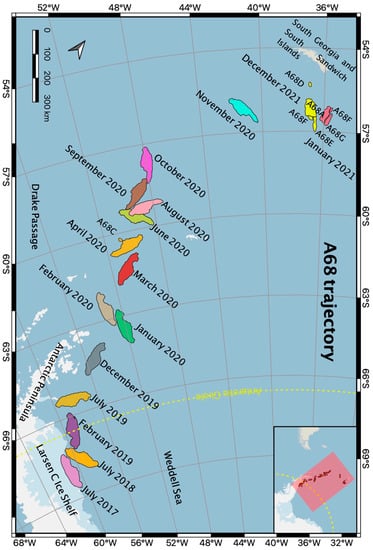 2.1. Collapse of the Larsen C Ice Shelf and Evolution of Iceberg A68