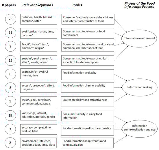 Hence, this paper intends to fill these gaps through a systematic literature review of scientific research that combines knowledge on food consumers’ and food information users’ behaviour [11]. The systematic literature review highlights the research topics in the informational perspective of food consumer behaviour, as fundamental entities valuable for consumers when involved in food-related activities.