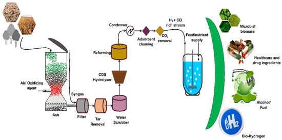 Biomass gasification produces syngas, mainly comprised of CO and H2 along with H2S, CO2, N2, and tar compounds. Inorganic carbon present in syngas as CO and CO2 can be utilized for the production of several value-added chemicals including ethanol, higher alcohols, fuels, and hydrogen. However, chemical sequestration operates at a high temperature of 300–500 °C and pressure of 3–5 MPa in the presence of heavy metal catalysts. Catalyst regeneration and the maintenance of high temperature and pressure increased the cost of operation. Microorganisms like algae and bacteria including Acetobacterium and Clostridium also have the potential to sequester carbon from the gas phase. Research has emphasized the production of microbial metabolites with a high market value from syngas. However, scale-up and commercialization of technology have some obstacles like inefficient mass transfer, microbial contamination, inconsistency in syngas composition, and requirement for a clean-up process. The current review summarizes the recent advances in syngas production and utilization with special consideration of alcohol and energy-related products along with challenges for scale-up.