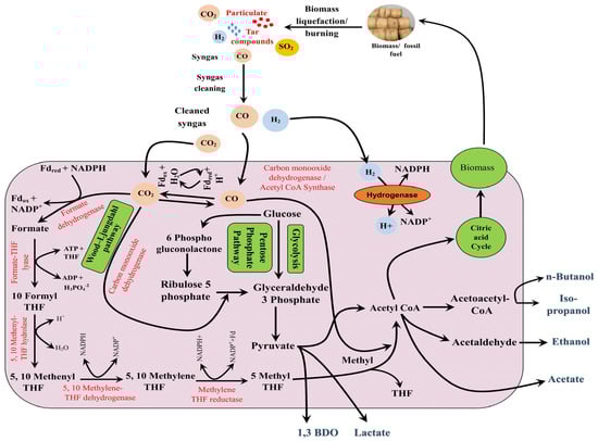 It is clear from the above examples that chemical catalysis offered very high selectivity and tenability for syngas conversion to alcohols and other products, but like other processes, it also operates at a very high-temperature range, from 350–600 °C, and pressure. In addition, the cost of catalysts is also very high in the case of Rh, Pd, Pt, etc., which need regeneration after regular intervals. The process also employed solvents which may be hazardous. Overall, technical feasibility, process cost, and environmental suitability make it more challenging to find some eco-friendly alternatives. In order to make the conversion process sustainable and cost-effective over chemical catalysis, biological sequestrations have been adopted. This approach emphasized the utilization of major components of syngas, i.e., CO, H2, and in some cases COx and NOx as well in regular metabolic pathways of microorganisms via assimilation into various value-added chemicals and microbial biomass.
