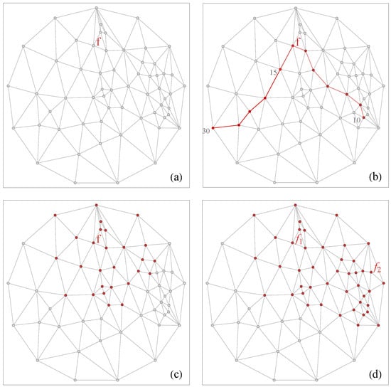 A planar graph services and paths: (a) graph G; (b) in red the shortest paths from vertices 10, 15, and 30 to service f (c) 15-minute vertices for service f; (d) 15-minute vertices for two equivalent services and .