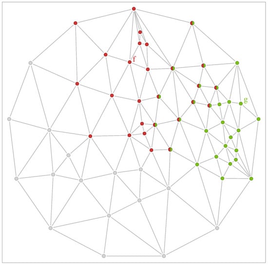 Graph of 15-minute city. The green (red) nodes reach service g (f) in less than 15 min, while the green–red nodes can access both services in less than 15 min.