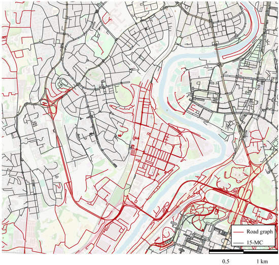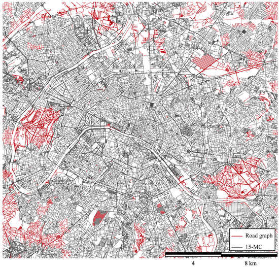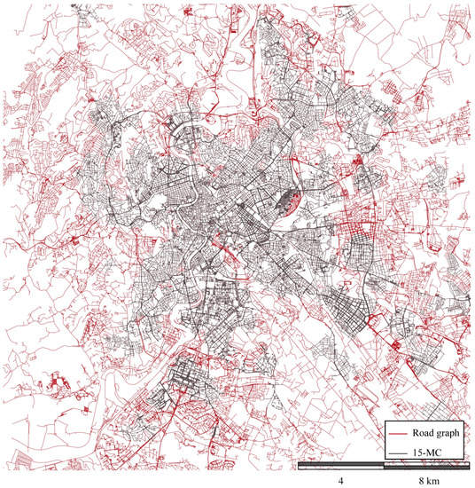 Despite the simplicity of this formula, it can reveal hidden urban characteristics, such as disjointed components of subgraph . The set C depends on the travel time t, the service matrix , and the travel speed v: the 15-MC of cyclists is different from the 15-MC of pedestrians. The graph of the 15-MC can be defined as