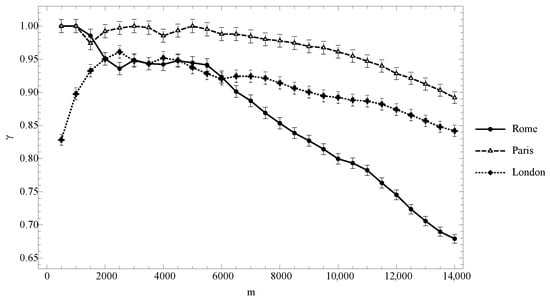where is the center, and r is the radius. The center can be placed on a possible city center, consistent with the analyses of 15-MC, which confirm that the center tends to be more 15-MC than suburban areas [39]. The value of is the average value of the spatial coordinates of the services. For the city of Rome, this point is located at Esquilino Hill, very close to the place of foundation, confirming the urban structure’s historical radial development [40]. In Paris, the mean value of the services is near the Jardin du Luxembourg, while in London, it is at St. John’s Smith square, Westminster.