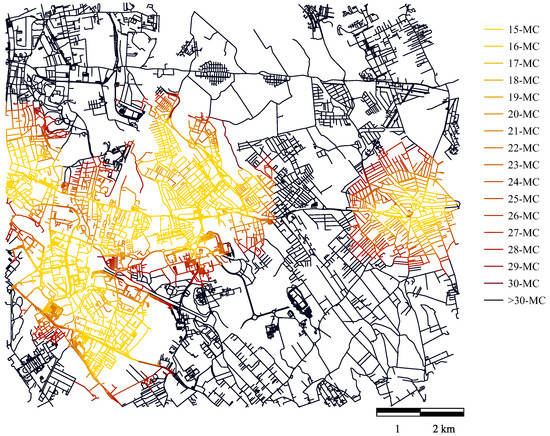 The second relevant aspect of the model is that the 15-MC is calculated on a set of heterogeneous services, thus showing the possible conflict between two types of utilities on the graph. In this sense, the graph topology given by Equation (3) is also the map of possible space use conflicts.