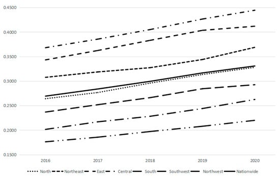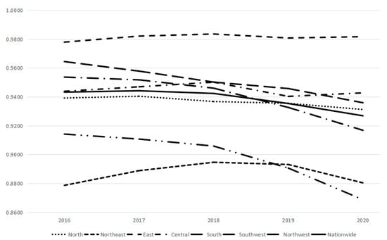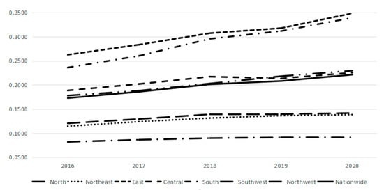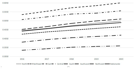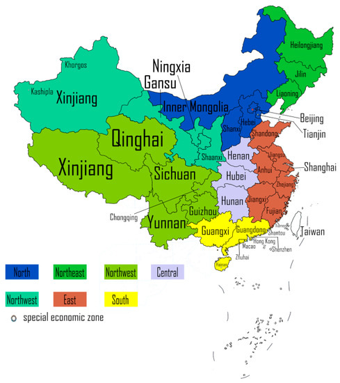 In order to improve the readability of the empirical analysis results, the 31 provinces (municipalities directly under the Central government and autonomous regions) in China (excluding Hong Kong, Macau, and Taiwan) were divided into seven regions: North, Northeast, East, Central, South, Southwest, and Northwest (