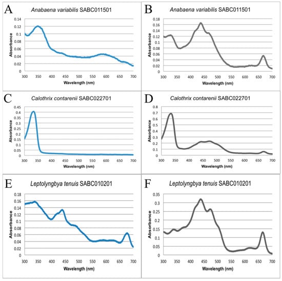 Absorption spectra of 20% (blue) and 90% (black) methanolic extracts of three representative cyanobacterial isolates. (A,B) Anabaena variabilis SABC011501; (C,D) Calothrix contarenii SABC022701; (E,F) Leptolyngbya tenuis SABC010201. Presence of peaks at 310–360 nm indicate the presence of mycosporine-like amino acids (MAAs).