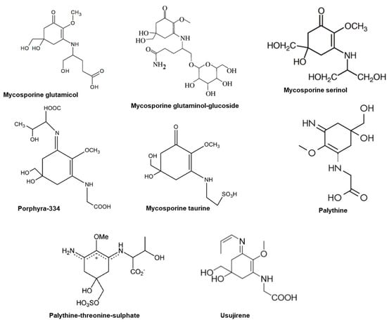 - Bhatia, S.; Garg, A.; Sharma, K.; Kumar, S.; Sharma, A.; Purohit, A.P. Mycosporine and mycosporine-like amino acids: A paramount tool against ultra violet irradiation. Pharmacogn. Rev. 2011, 5, 138–146. [Google Scholar] [CrossRef]
