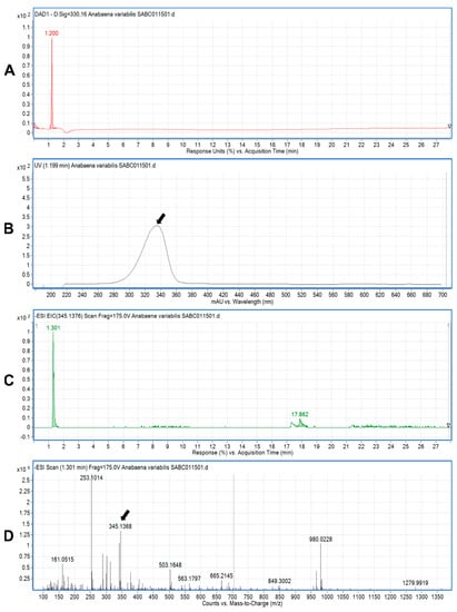 LC-MS analysis showing identification of Porphyra-334 in Anabaena variabilis SABC011501. (A) DAD profile at 330 nm; (B) UV spectra of the DAD profile peak at 1.2 min; (C) extracted ions chromatogram of accurate mass for Porphyra-334 in negative mode (345.1376) showing specific peak; and (D) ESI scan showing the mass spectra including m/z 345.1368 for porphyra-334.