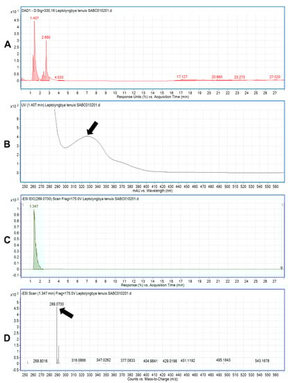LC-MS analysis showing detection of unknown compound (M-326) in Leptolyngbya tenuis SABC010201. (A) DAD profile at 330 nm; (B) UV spectra of the DAD profile peak at 1.4 min; (C) extracted ions chromatogram of mass for unknown compound M-326 in negative mode (289.0730) showing specific peak; and (D) ESI scan showing the mass spectra including m/z 289.0730 for M-326.