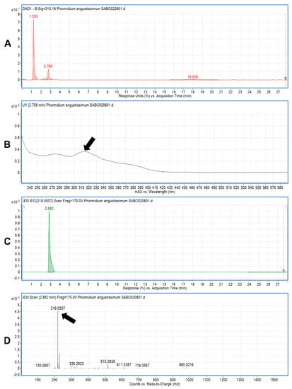 LC-MS analysis showing detection of unknown compound (M-314) in Phormidium angustissimum SABC020801. (A) DAD profile at 310 nm; (B) UV spectra of the DAD profile peak at 2.7 min; (C) extracted ions chromatogram of mass for unknown compound M-314 in negative mode (219.0557) showing specific peak; and (D) ESI scan showing the mass spectra including m/z 219.0557 for M-314.