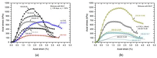Figure 2 presents some stress–strain curves of tested specimens obtained from the UC tests for various mixing proportions. It is noted that the BA with a fine grain size distribution, BA-F, was considered for investigating the strength characteristics of specimens in this subsection. As seen in Figure 2a, for both cement-admixed clays with and without BA involving wr of 130% at tc of 28 days, the maximum stress or strength increases with the increase in both C and Bc. This is mainly attributed to the cement hydration reaction, resulting in the dissociation of calcium ions, which further creates calcium silicate hydrate (CSH) gel and Ca(OH)2. The CSH gel acts as a cementitious substance that provides adhesive properties to clay particles for forming a bond together with the clay particles or clusters of clay particles, while Ca(OH)2 is a byproduct of the cement hydration procedure [20,24,25]. Subsequently, due to the SiO2 components in BA absorbing the Ca(OH)2 given by the cement hydration reaction, the pozzolanic reaction is then developed, which also generates the augmentative CSH gels to enhance more bonding development between clay particles [21,26]. This phenomenon is confirmed by comparing the results of specimens with the mixing proportions of C = 20% by varying the Bc from 0 to 35%, as depicted in Figure 2a. Interestingly, cement-admixed clay with C = 20% and Bc = 15% can provide a relatively similar strength to the mixture with C = 30% without BA. This indicates that the additional BA can significantly improve the strength of the mixture. At the same strength, cement–BA-admixed clays exhibit a strain at a peak strength that is less than cement-admixed clays. In other words, by adding more BA, the mixture becomes much more brittle, in which the stresses are dropped abruptly with the developed strain after peak stress.