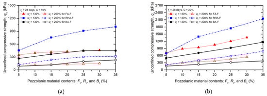 Correlation between qu and pozzolanic material contents of cement-admixed clays blending with BA-F (This study), FA-F (data from [20]), and RHA-F (data from [21]) at tc of 28 days for different C: (a) C = 10%; (b) C = 20%.