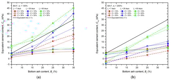 Figure 6 presents the relationship between the actual BA content, Bc in each mixture and the calculated Ceq for different wr of 130% and 200% in association with various tc of 7, 28, and 60 days. The equivalent line with a slope 1:1 is also included in the figure. As seen in this figure, it is demonstrated that the efficiency of adding up the BA into the cement-admixed clays can be revealed. The Ceq of cement–BA-admixed clays increase with increasing C and tc, but decreases with an increase in wr. For wr = 200% (Figure 6b), adding BA enhances the strength of the cement–BA-admixed clay mixtures with the inferior equivalent efficiency in which most data points are located under the equivalent line. However, for a tc of 28 days and high cement content (i.e., C = 30%), adding BA with a content of 35% can improve the strength of the mixture involving wr of 130% better than Portland cement as the point is over the equivalent line (Figure 6a). Furthermore, in a long-term situation (i.e., 60 days for this study) for the mixtures with low water content (i.e., wr = 130%), it is indicated that the high efficiency of adding up BA together with large cement content (i.e., C = 20–30%) is obtained as all points of these data sets are beyond the 1:1 line, as depicted in Figure 6a. This reveals the possibility of using BA to replace or add up the Portland cement in the cement-admixed clay applications for cost-effectiveness.