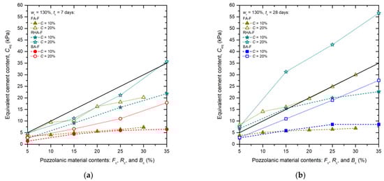 Correlation between Ceq and pozzolanic material contents of cement-admixed clays blending with BA-F (This study), FA-F (data from [20]), and RHA-F (data from [21]) with C = 10 and 20% at wr = 130% for different tc: (a) tc = 7 days; and (b) tc = 28 days.