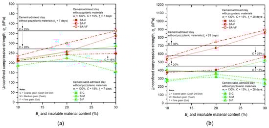 qu versus Bc and insoluble material content of cement-admixed clays blending with various grain size distributions for different tc: (a) tc = 7 days; and (b) tc = 28 days.